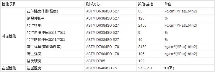 密度:1.18-1.22 g/cm^3 線膨脹率:3.8×10^-5 cm/°C 熱變形溫度:135°C 低溫-45°C