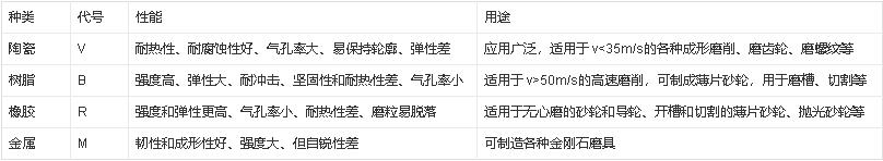 砂輪中用以粘結磨料的物質稱結合劑。砂輪的強度、抗沖擊性、耐熱性及抗腐蝕能力主要決定于結合劑的性能。常用的結合劑種類、性能及用途見表4。