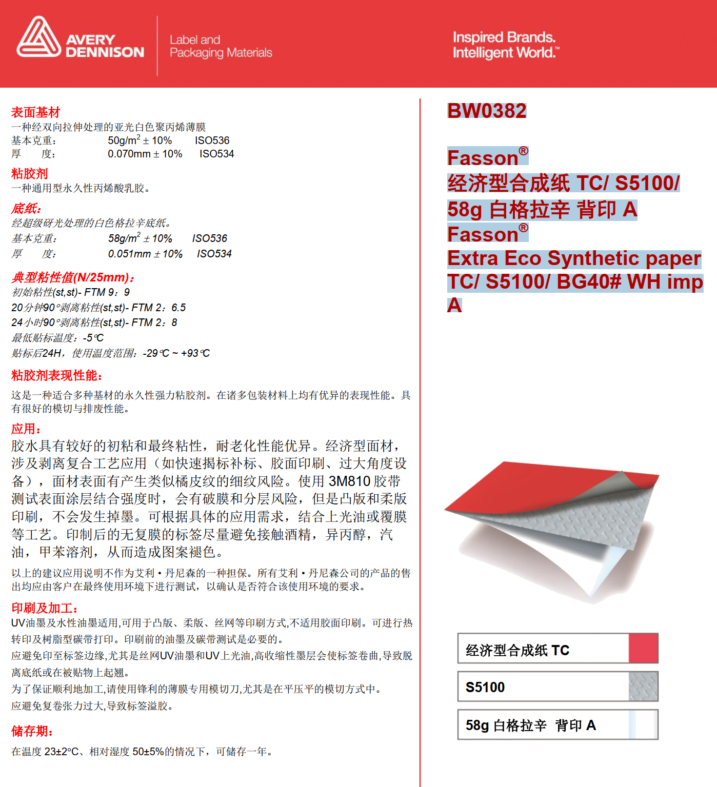 蘇州工業園區SUNTECK TECNOLOGY非標彩印模切供應廠商-受托印刷AVERY DENNISON BW0382-Fasson經濟型PP合成紙 TC/ S5100/58g 白格拉辛 背印 A Fasson Extra Eco Synthetic paper TC/ S5100/ BG40# WH imp A