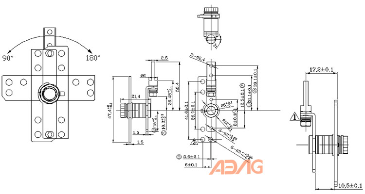 3.側(cè)軸旋轉(zhuǎn)角度360°,預(yù)壓角度:3°±2°,中軸旋轉(zhuǎn)角度:順轉(zhuǎn)180°±2°, 逆轉(zhuǎn):90°±2°,出貨角度為0(如圖所示)。