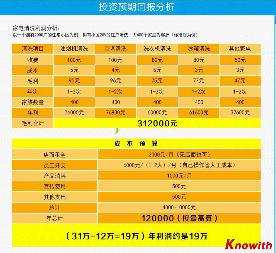 一、 在一個10萬人口的縣城開一個家電清洗旗艦店,有2000戶家庭辦了200元的清洗年卡,年收益就是2000×200=40萬元。扣除員工工資、店面費用、清洗產(chǎn)品消耗5萬元。凈利潤是:35萬元。總體評測分析 (單位:元)以上數(shù)據(jù)為理論計算數(shù)字,且不包含在服務過程中“宜家”后續(xù)產(chǎn)品銷售數(shù)據(jù)統(tǒng)計,實際情況需根據(jù)各地區(qū)及經(jīng)營者具體經(jīng)營而定。